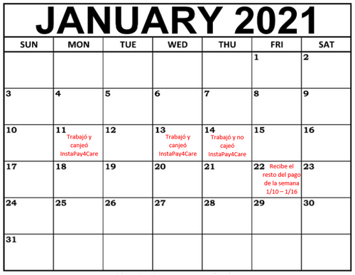 Por ejemplo, si trabajó el lunes 11 de enero y el miércoles 13 de enero y canjeó InstaPay4Care por esas dos visitas, el resto de su pago aparecerá en el cheque de pago que reciba el viernes 22 de enero. Esto se debe a que se le paga todos los viernes por la semana anterior. Por ejemplo, su cheque de pago que recibe el viernes 22 de enero es para la semana del domingo 10 de enero al sábado 16 de enero. Vea la imagen a continuación para más información.