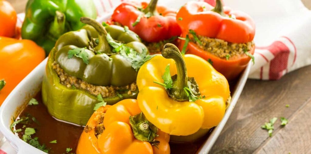 These stuffed green peppers put a fun spin on the classic Mexican stuffed poblano peppers. Delicious and full of protein, vitamins (specifically B12), and minerals, combine this dish with a fruit salad or smoothie to round out a nutrient-packed dinner meal.